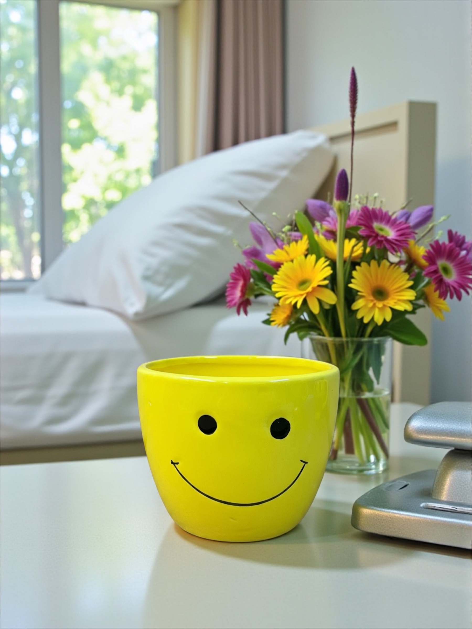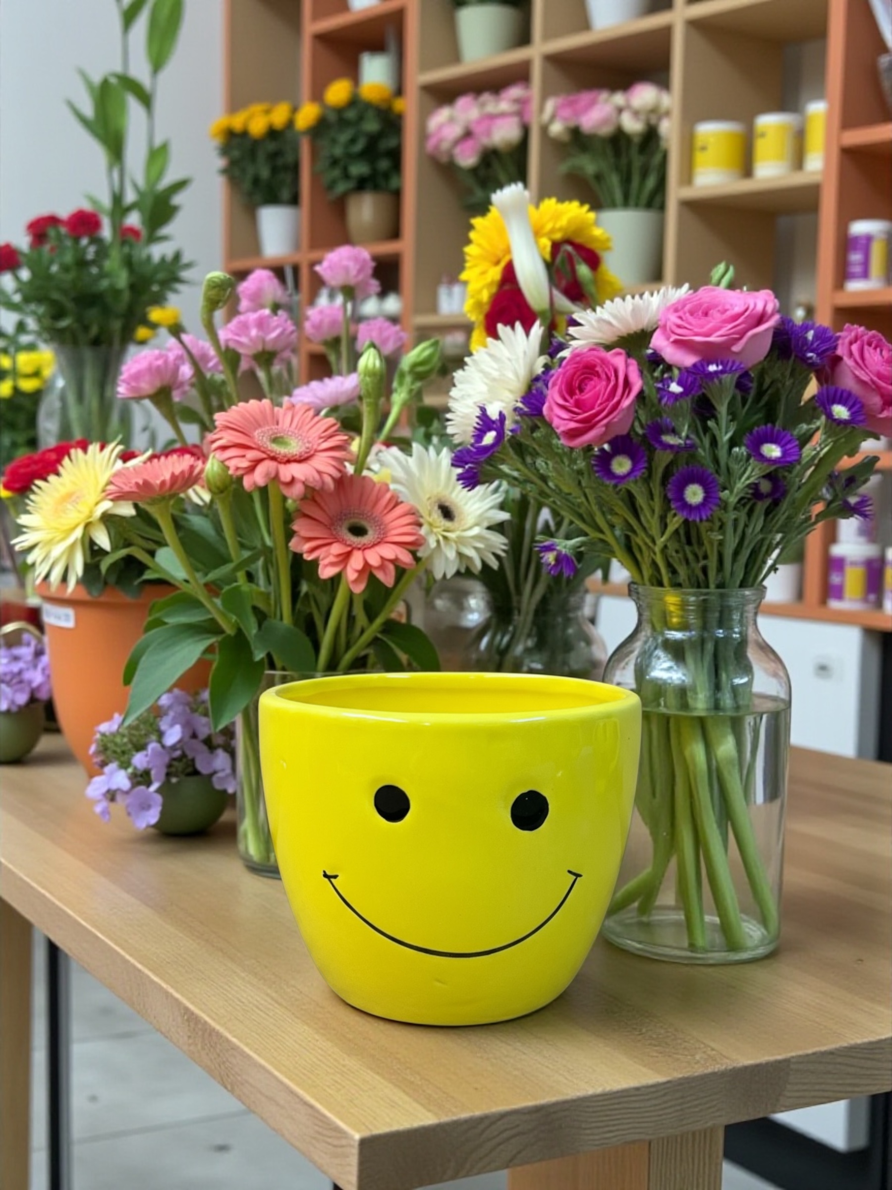 4.5″ Yellow Smiley Face Ceramic Round Floral Design Container.