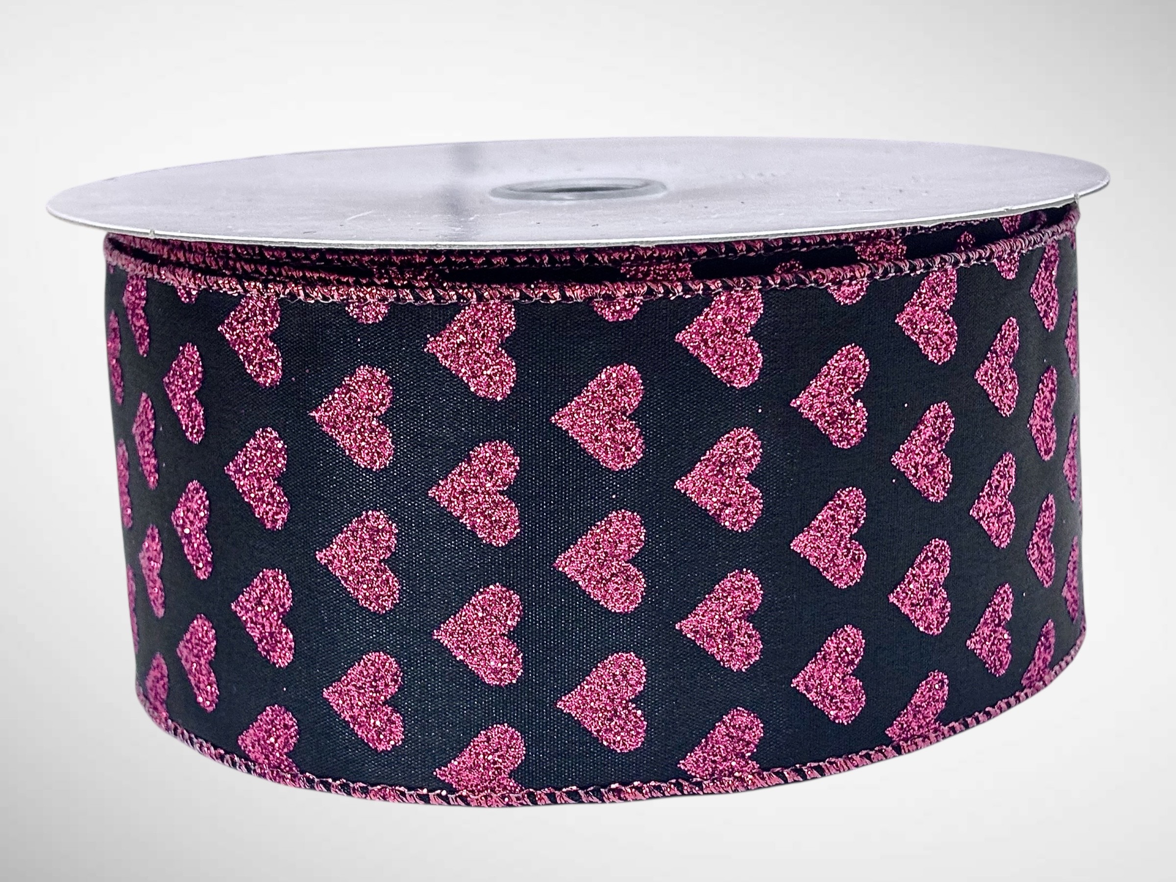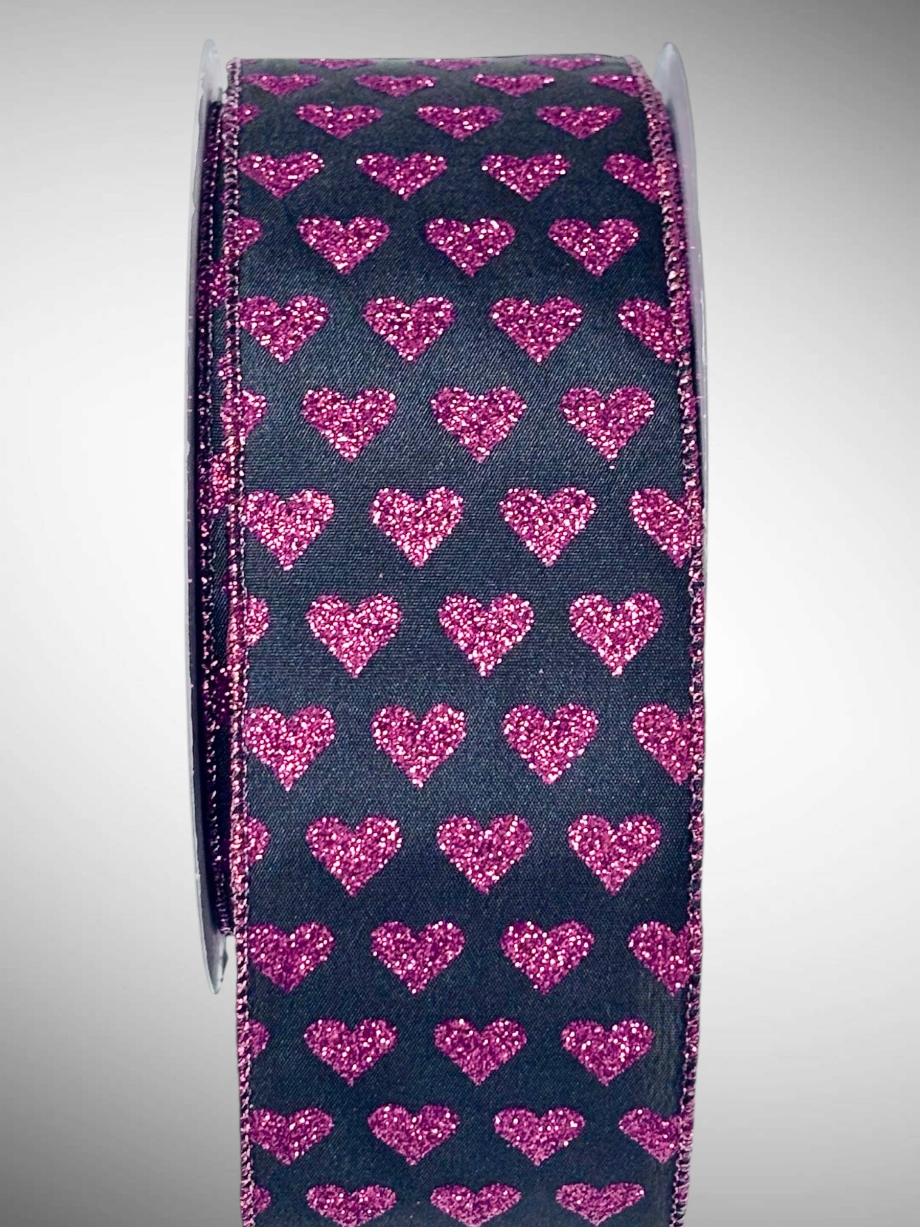 #40 Wired Hearts Ribbon, black background with red glittery hearts embellishing the center of ribbon, (2.5″ x 25 yds.)  Perfect Ribbon to use for Valentine’s Day Gift decorating!