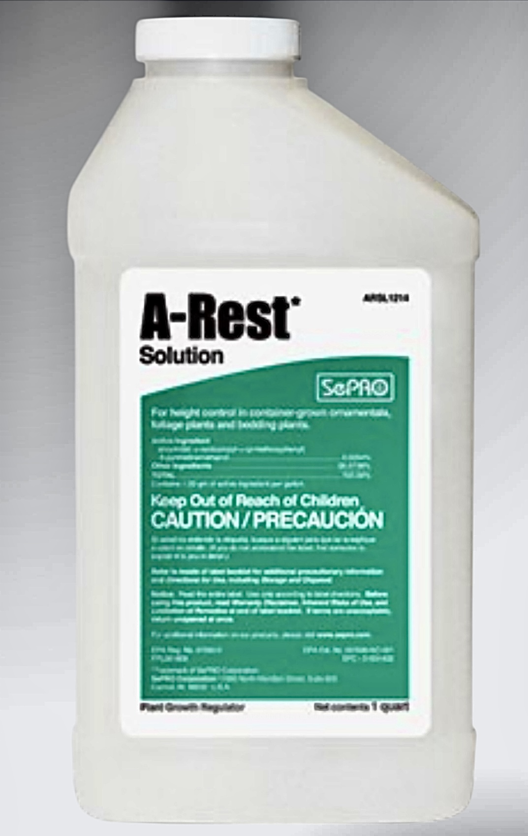 A-Rest is a plant growth regulator which is used on container grown bedding plants, flowers and foliage plants. Gentle enough on tender plugs and transplants yet strong enough to adequately regulate perennials. This helps growers produce high quality plants that are more compact, uniform in height, darker in color, more able to withstand shipping and require less watering.
