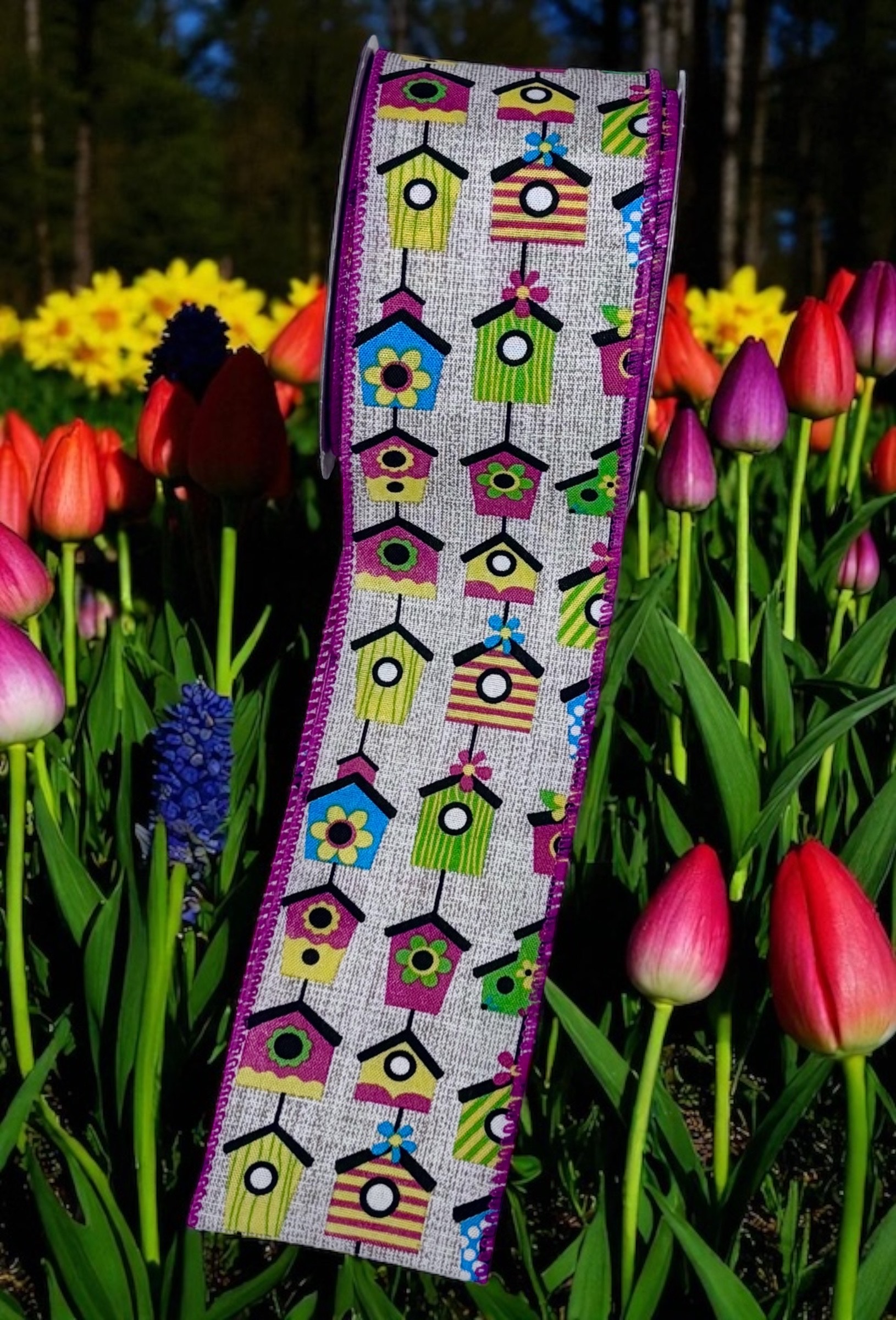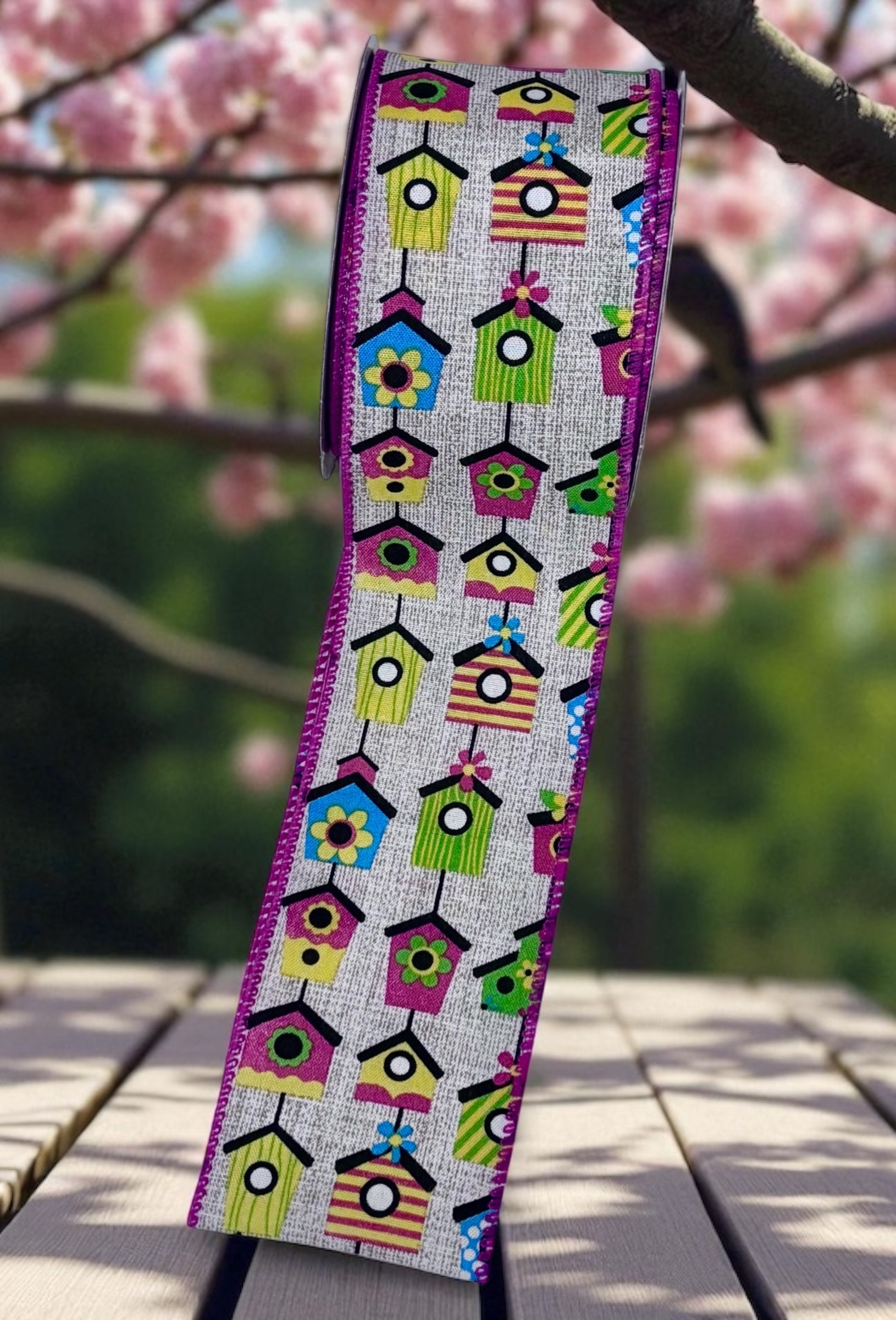 This Ribbon is #40 Beige/White rustic barn wood background with Fuchsia Thread Wired edge and has Very Colorful decorated Birdhouses of stripes, polka-dots and Daisy shaped Flowers in bright shades of Yellow, Pink, Blue, Green, perfect to use in Spring or Garden Floral Arrangements & Design work! – (2.5″ x 10 yds.) – 100% polyester.