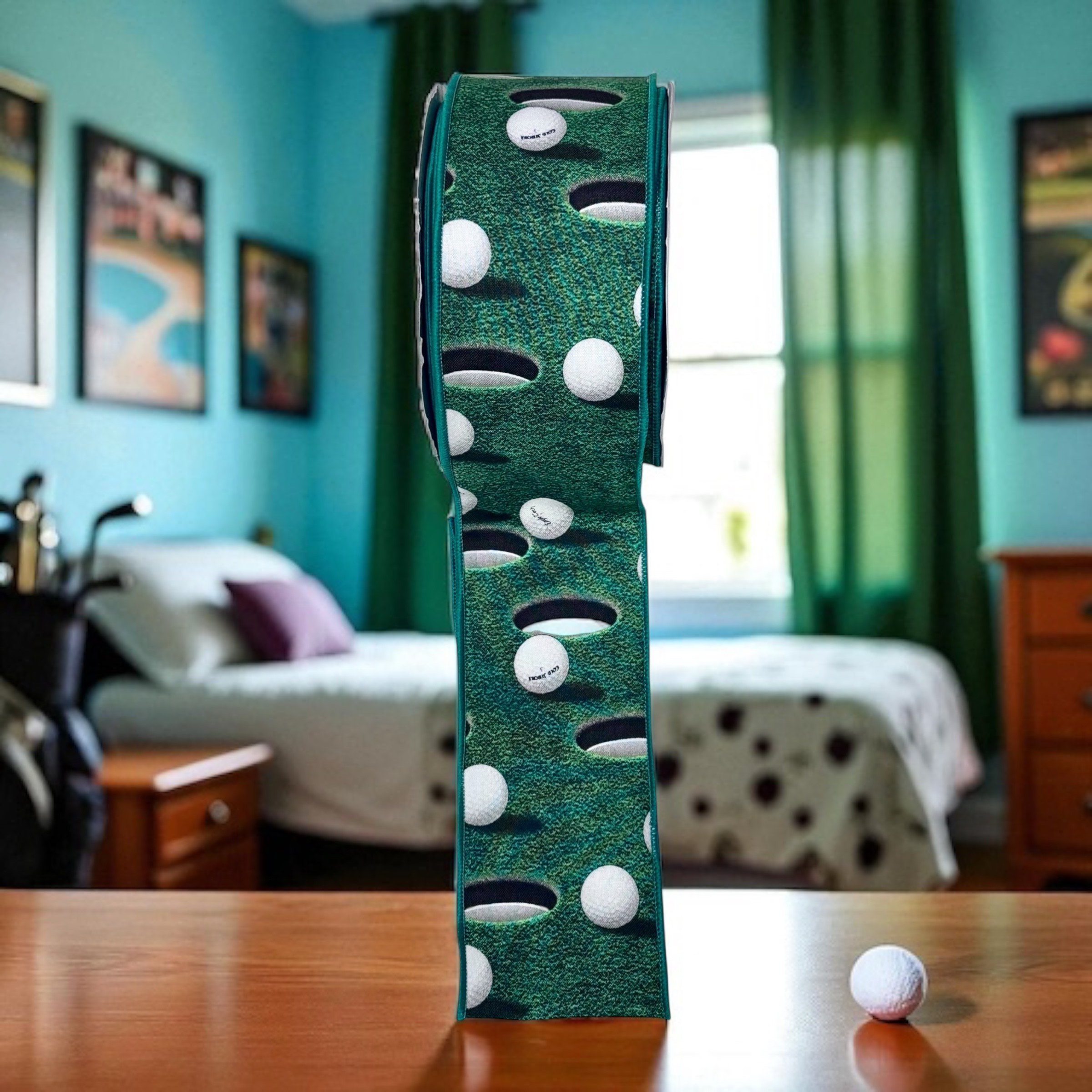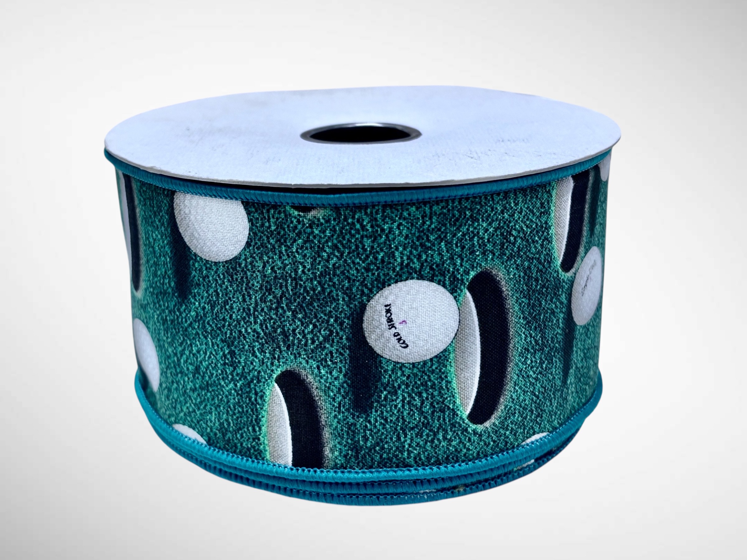 This Ribbon is a pattern of Golf Course Grass Putting-Green Turf with golf ball on its way to dropping into the Hole!  It is #40 with Green thread Wired Edge, (2.5″ x 20 yds.) – 100% Cotton, made in the USA.  Its Perfect to use for Golf Events or is a Great Sports theme ribbon for designs that inspire Golf Players.