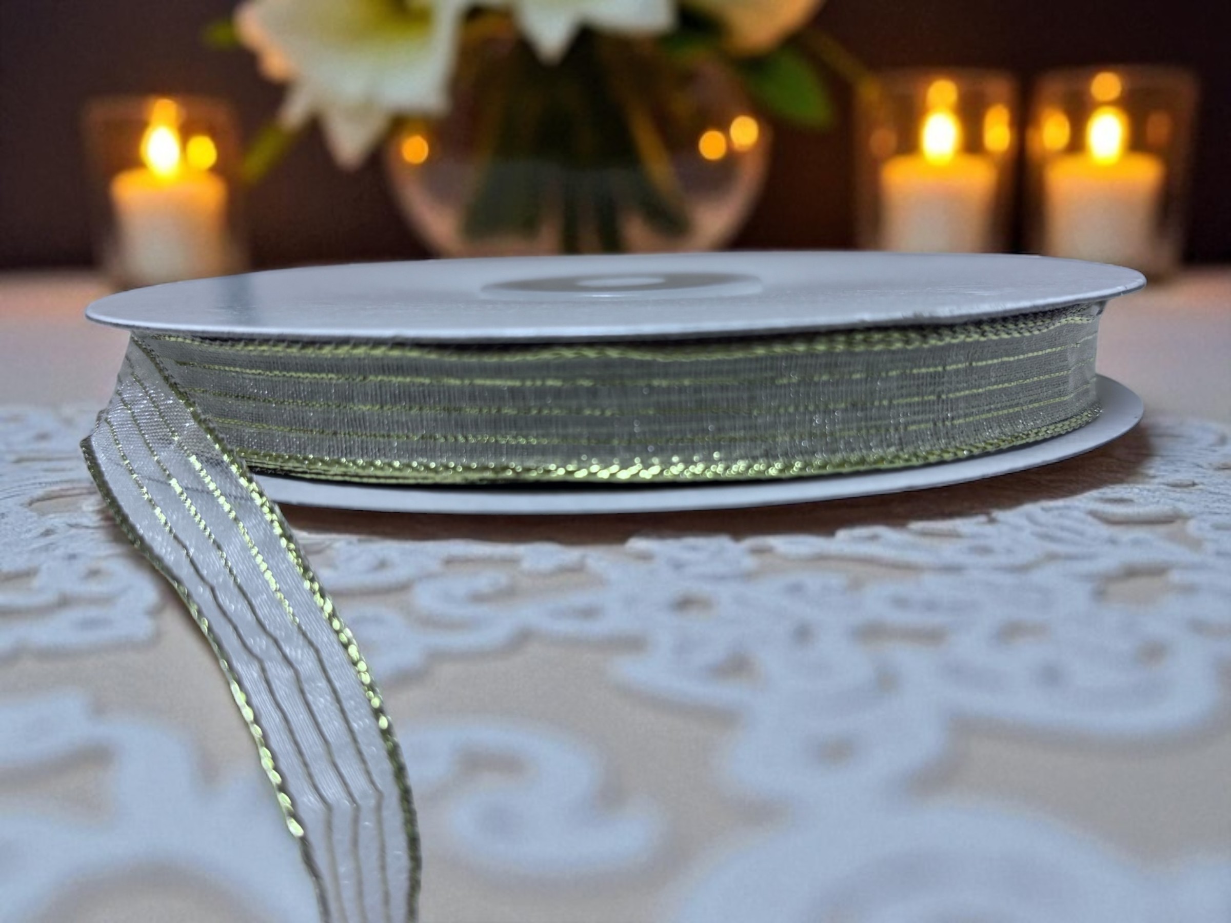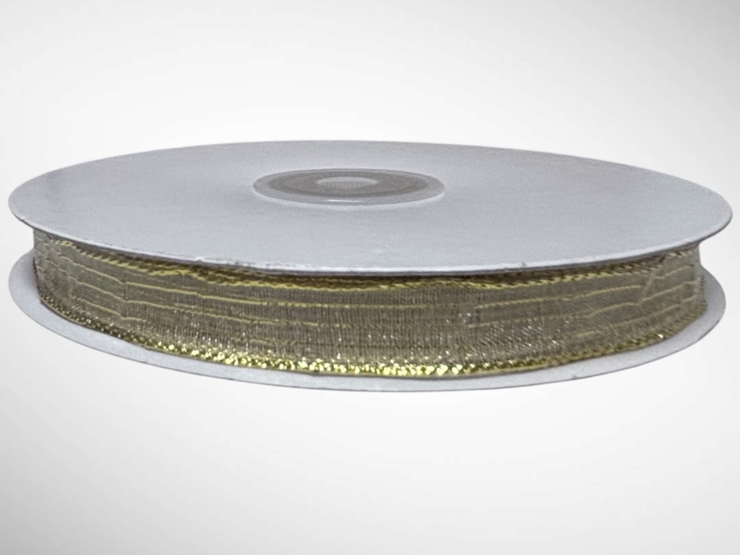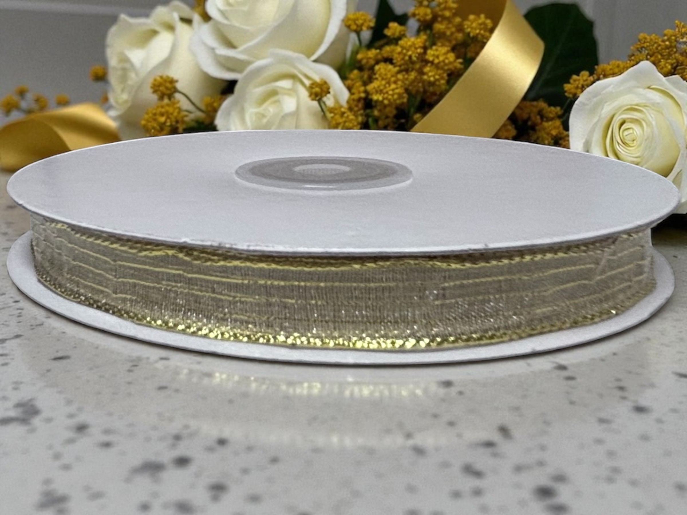 Metallic Gold Stripe Ribbon, #1.5 (3/8″ x 50 yds.) – Narrow Monofilament Corsage Ribbon, material is transparent 55% nylon with 45% metallic gold pin stripes. – Available in many colors.