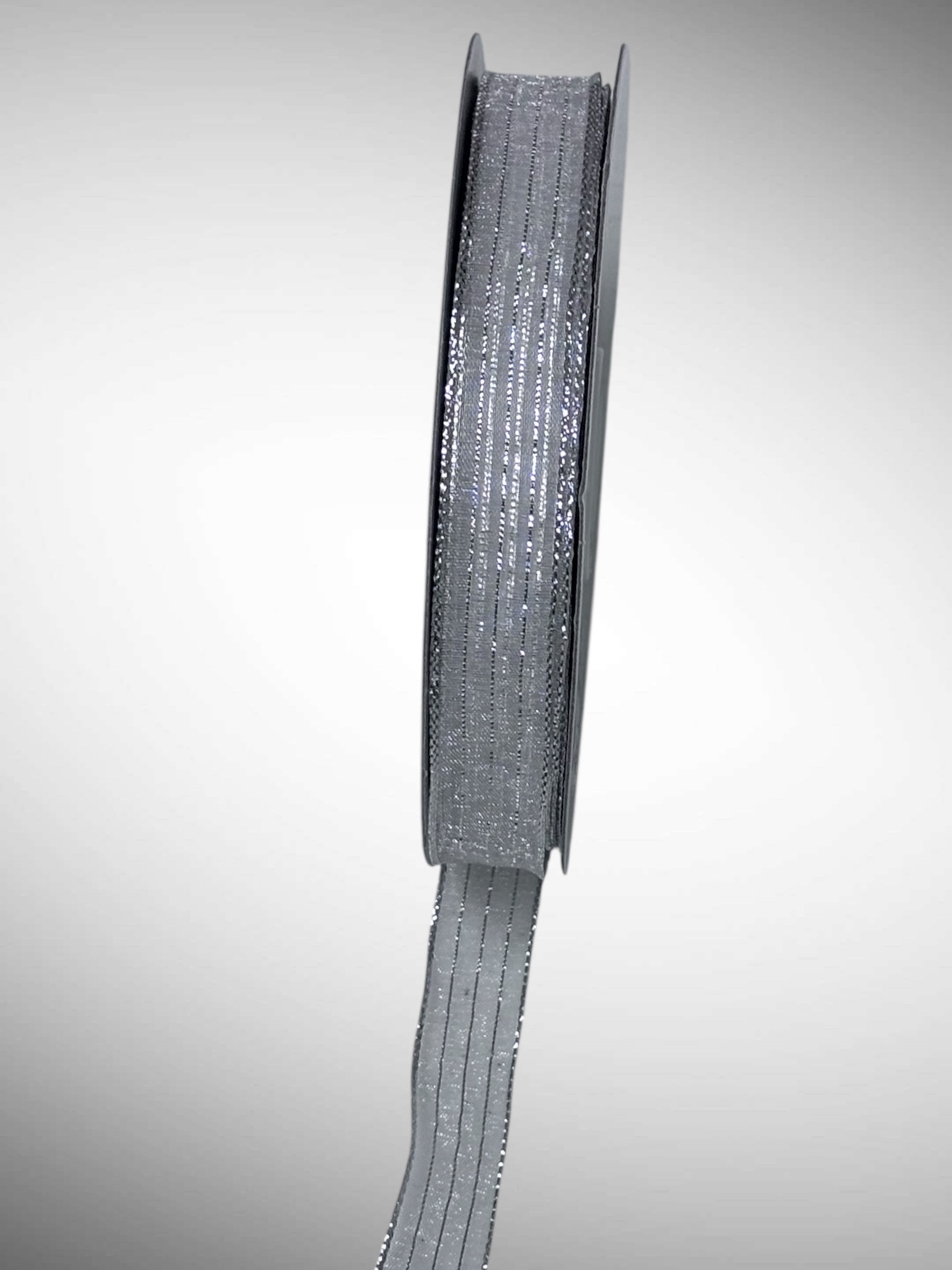 Metallic Silver Stripe Ribbon, #3 (5/8″ x 50 yds.) – Narrow Monofilament Corsage Ribbon, material is transparent 55% nylon with 45% metallic silver pin stripes. – Available in many colors.