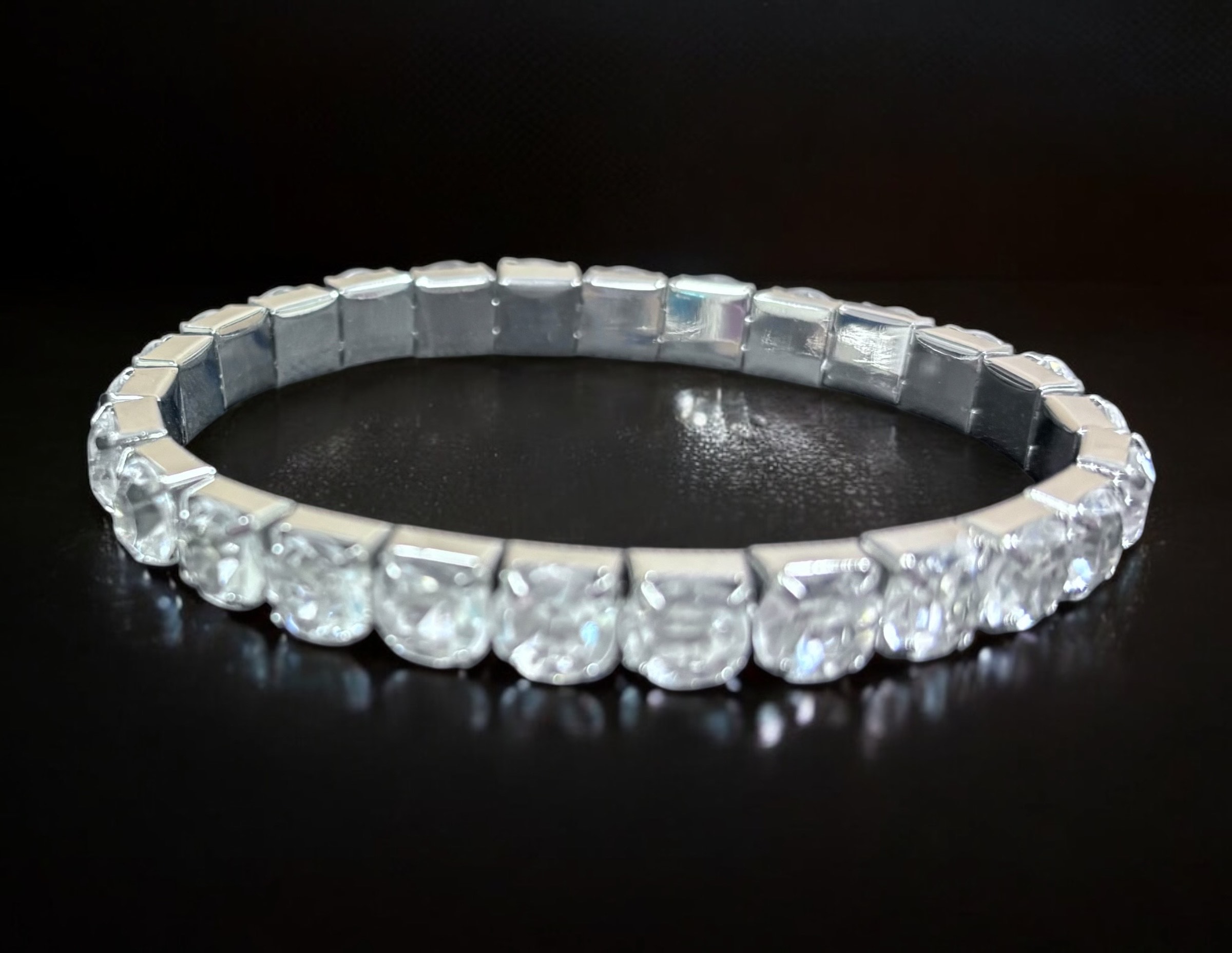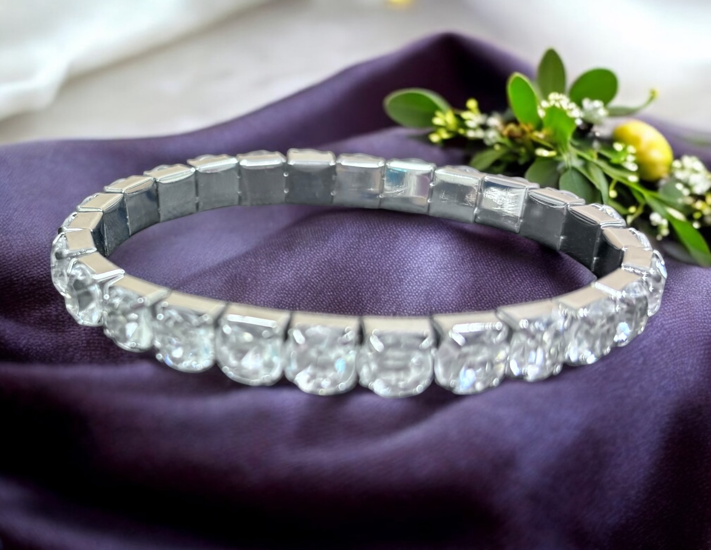 A Beautiful Single Strand Crystal Tennis Bracelet (Faux Rhinestones) for use in designing a flower wrist corsage. Is an elastic band and one size fits all. An Elegant Corsage Bracelet that is perfect for proms, weddings and special occasions. The floral pad can be easily removed and you have a keepsake fashion bracelet.