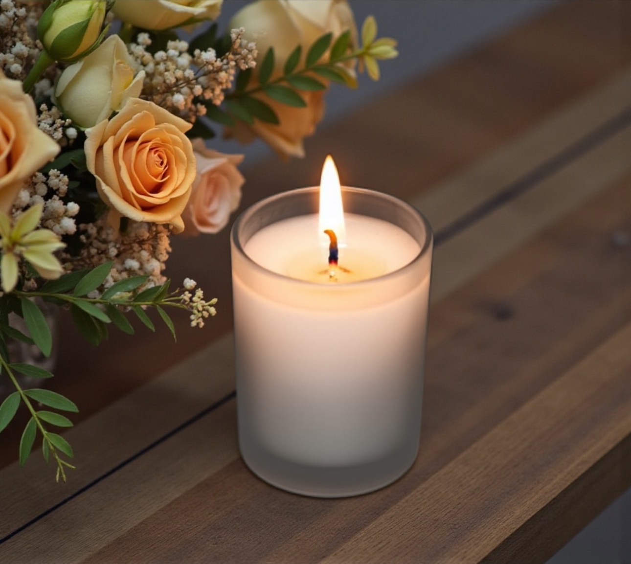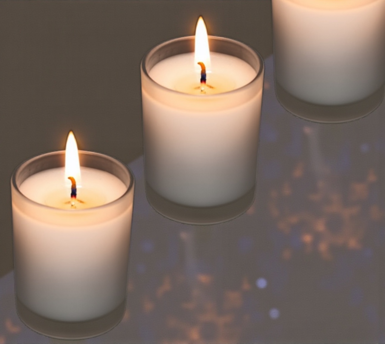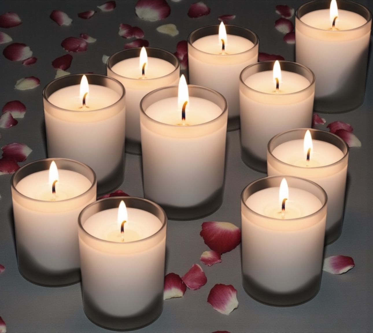 White Votive Candle in Frosted Glass Cylinder – Burn time: up to 10 hours (unscented). 10HR-UV-25